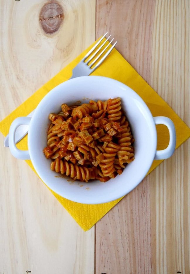 Una volta preparato il sugo lasciatelo nella padella finché non avrete scolato la pasta. A quel punto unitela direttamente nella padella e mescolate finché il sugo non avrà coperto completamente la pasta. Un ultimo consiglio, cucinate la pasta al dente e accendete nuovamente la fiamma sotto il sugo preparato per far si che si finisca di cuocere con la passata ed il tofu in modo che si amalgami alla perfezione. A questo punto servite ed assaporate e buon appetito!